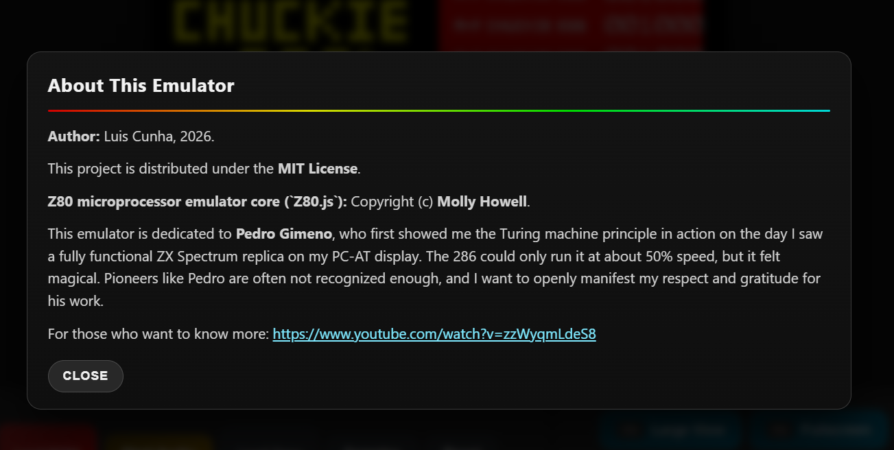 A small, self-contained ZX Spectrum 48K emulator that runs entirely in the browser using a JavaScript Z80 CPU core.